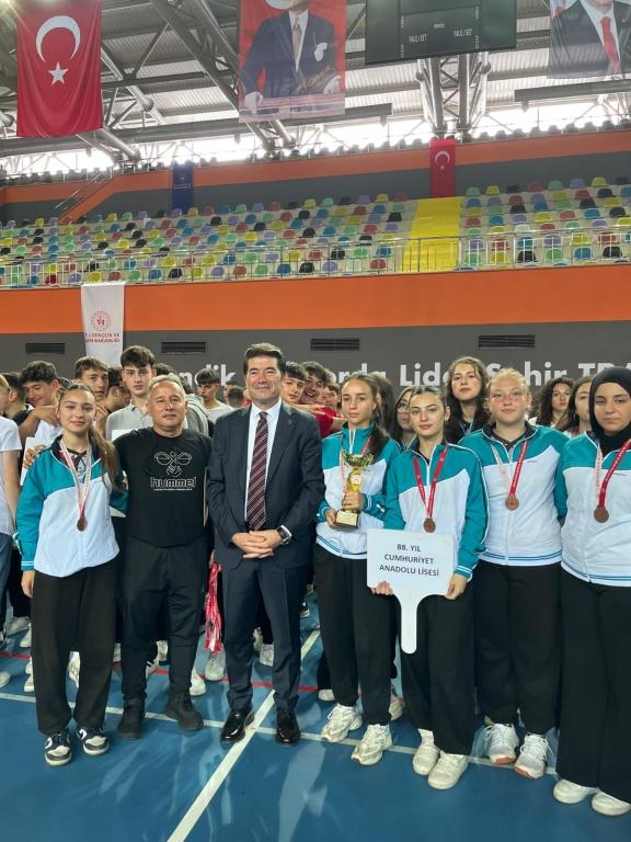 İlimizde düzenlenen okullar arası Genç Kızlar B Voleybol turnuvasında 6 galibiyet ve 2 yenilgi alarak il dördüncüsü olan öğrencilerimiz yapılan toplu kupa töreninde kupasını aldı. Öğrencilerimizi ve danışman öğretmelerini tebrik eder başarılarının devamını dileriz.
